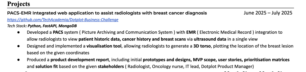 - They’ve listed their tech stack, so it’s easy to quickly glance which projects they’ve used. Remember recruiters only scan your CV for 6-7 seconds.