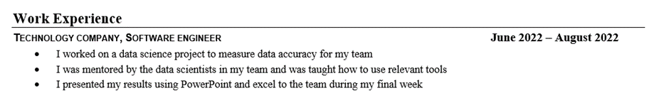 Lastly experience does not need to necessarily be a formal internship or work experience program. It could be a hackathon, a competition, an insight day, a mentoring program, retail job etc. As long as you gained tangible experience and drove impact, you can include it on your CV.
