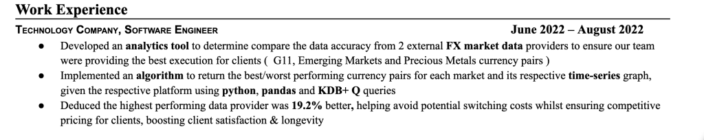As we can see, the main difference between the two example are specifics. In example 1, you’re not really sure exactly what the candidate did and why it was important. In example 2, we fully understand what the candidate did, and the work is domain-specific. In this case, we can clearly tell this experience was a financial project ( analysing foreign exchange market data ).